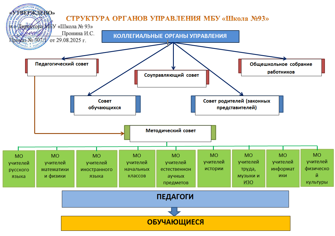 Форма обучения: очная Наличие общежития, интерната, в том числе приспособленных для использования инвалидами и лицами с ограниченными возможностями здоровья - отсутствуют. СП Центр "Гражданин" решает комплекс образовательных и воспитательных задач, нацеленных на претворение в жизнь идеи гражданского воспитания и образования. Положение о СП Центре дополнительного образования "Гражданин" (электронный документ. pdf версия документа для слабовидящих PDF/UA) Место нахождения: 445047,РФ, Самарская область, г. Тольятти, 40 лет Победы, 10, МБУ "Школа №93", Музей Отваги тел. 8(848)2- 72-12-60 e-mail school93@edu.tgl.ru Координируют деятельность Центра методист высшей категории Горяинова Жанна Николаевна Время работы: пн - пт с 08:00 до 17:00 СП Центр "Школьная академия" дает возможность заказа образовательных услуг для любого обучающегося по различным образовательным направлениям и создает условия для успешной адаптации и социализации личности ребенка. Положение о СП Центре дополнительного образования "Школьная академия" (электронный документ. pdf)версия документа для слабовидящих PDF/UA) Место нахождения: 445047,РФ, Самарская область, г. Тольятти, 40 лет Победы, 10, МБУ "Школа №93", кабинет № 101 тел. 8(848)2- 72-12-60 e-mail school93@edu.tgl.ru Координирует деятельность Центра методист первой категории Петухова Кристина Викторовна Время работы: пн - пт с 08:00 до 17:00 СП "Бассейн" реализует основные образовательные программы по физической культуре (раздел «Плавание») и дополнительные образовательные программы физкультурно-спортивной направленности. Положение о СП "Бассейн" (электронный документ. pdf)версия документа для слабовидящих PDF/UA) Место нахождения: 445047,РФ, Самарская область, г. Тольятти, 40 лет Победы, 10, МБУ "Школа №93", 1 этаж бассейн тел.8(848)2- 72-12-60 e-mail school93@edu.tgl.ru Координирует деятельность бассейна зам. директора Бурхетева Нина Серафимовна Время работы: пн - пт с 08:00 до 17:00 Сведения об органах управления образовательной организацией Управление Школой осуществляется в соответствии с законодательством Российской Федерации и Уставом. Единоличным исполнительным органом Школы является руководитель Школы – директор, который осуществляет текущее руководство деятельностью Школы. Коллегиальными органами управления школы являются: